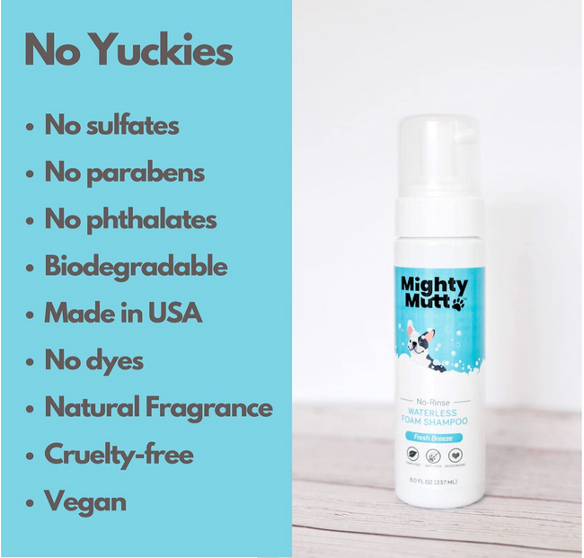 Perfect for in between baths or whenever your dog is not in the mood for a bath. PH-balanced, hypoallergenic, and suitable for even the most sensitive skin. Made in USA, 100% vegan and cruelty-free formula. Free from sulfates, parabens, dyes, phthalates, and other toxins that are harmful to dogs.